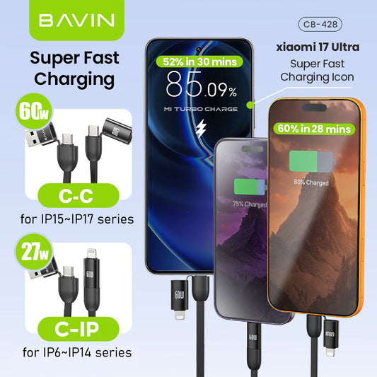 BAVIN CB428 4in1 Mini 60W PD Fast Charging Data Cable Keyring Multi-function for iPhone &Android Devices
