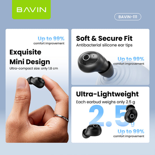 BAVIN BA111 Hi-Res TWS Mini Bluetooth 5.4 Wireless Earbuds w/ Noise Cancelling, Long Battery Life