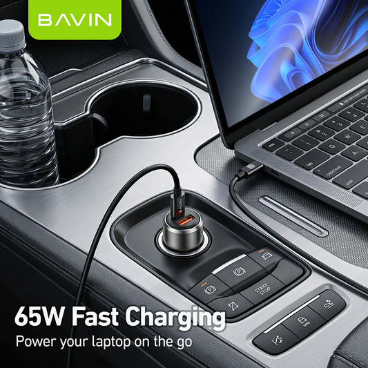 BAVIN PC2153 Mini 65W PD Fast Charging Car Charger w/USB-C+USB-A Ports+1m Cable for Phones/Laptops