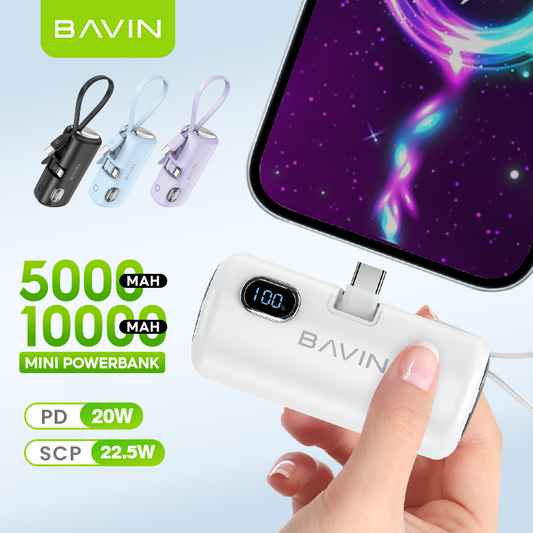 BAVIN PC1091S 5000mAh / PC1201S 10000mAh Mini Fast Charging Powerbank 22.5W USB-C Input/Output, Built-in Cable & Stand