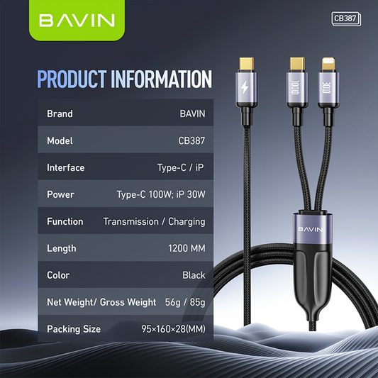 BAVIN CB387 100W 2 in 1 Fast Charging Cable Type-C to Type-C & iPhone w/ 1.2m Nylon Braided Cord for Laptop & Smartphones