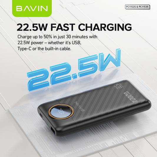 BAVIN PC1151 10000mAh Powerbank w/ 22.5W Triple Fast Charging Built-in Type-C & iPhone Cables | Smart LED Display