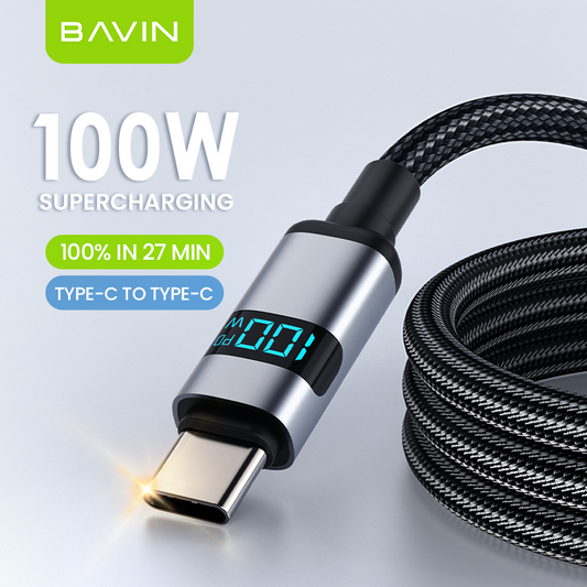 BAVIN CB368 100W PD Super Fast Charging Nylon Braided Data Cable w/ Digital Power Display For Laptop & Phones