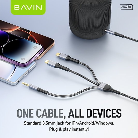 BAVIN H-3.5-AUX58 3 in 1 Hi-Fi Braided Audio Cable for 3.5mm, iPhone & Type-C