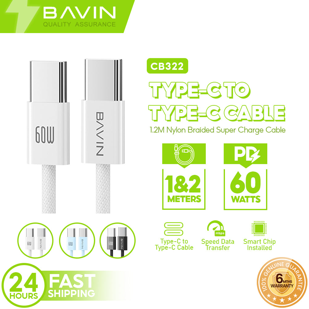 BAVIN U-CB322 60W PD Fast Charging Cable | Nylon Braided Type-C to Type-C Data Cable 1m/2m for Laptop & Mobile Phone